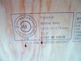 壁に手書きされた「GP9(W9)」「GP7」「GP6」の文字は、耐力壁の種類を表し、GP9は釘ピッチ50、GP7は釘ピッチ100、GP6は釘ピッチ150と、耐力壁の種類別に釘のピッチが決まっています。この住宅では面材には構造用合板(JAS特類2級)厚さ12mmを使っていて、合板の厚さやなどは、合板にあらかじめ押されたスタンプで確認することもできます。(厚さ9mmの構造用合板を使うこともあります)