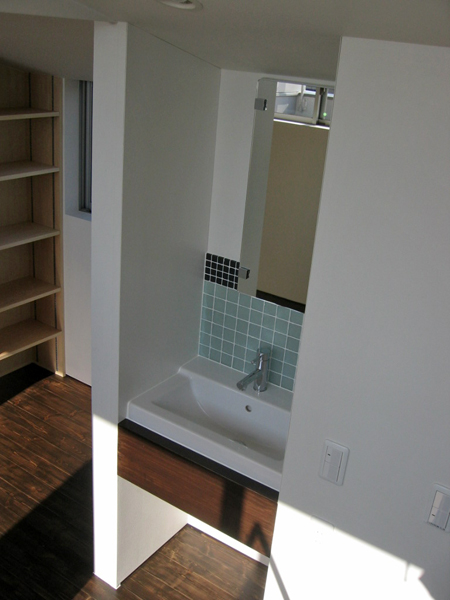 写真は『5層なのに3階建ての家』の3階洗面コーナーに、イケア・IKEAの洗面器と水栓を使用したものです。カタログには細かな寸法が記載されていないため、建て主の方には、早めに購入して現場に入れてもらい、現物に合わせながらカウンターに孔をあけ、配管を行ないました。設計事務所としては、工務店の方の理解をえながら、納入スケジュールの調整が必要となります。