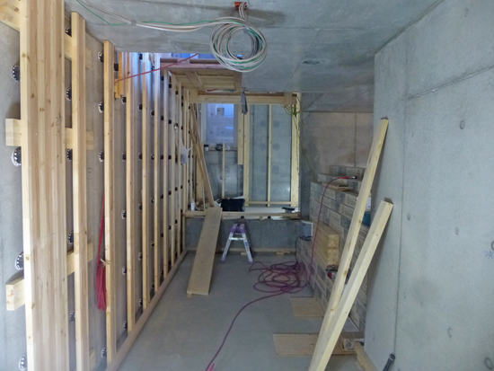 鉄筋コンクリート造の地下部分では、内装の壁下地(たて胴縁)が組まれてきました。外壁側には断熱材を吹付けるため、下地を鉄筋コンクリートの壁からスクリューパッキンで浮かせています。スクリューパッキンは、壁躯体の不陸を吸収しながら、垂直精度の高い壁下地を施工できる優れものです。壁下地の下には、際ネダと呼ばれる床下地材も施工されています。