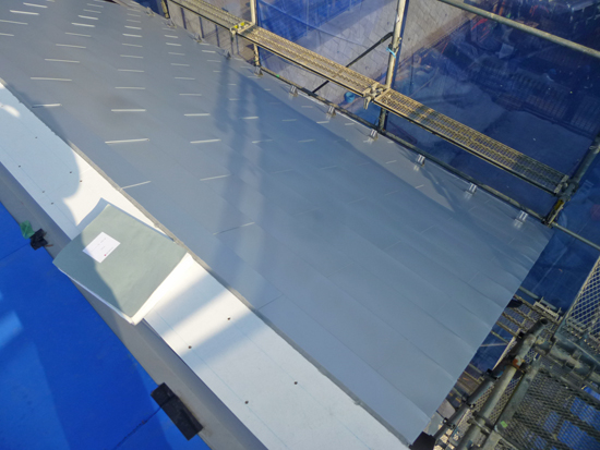 高度斜線がかかるため傾斜屋根としている部分に、ガルバリウム鋼板の屋根材が葺かれました。下側には雪止めを取付けています。