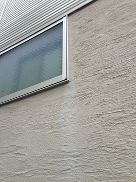 外壁に塗った左官材(石灰系)に、施工後直ぐに、白華(はっか:エフロレッセンス)が発生しました。[左写真:サッシコーナーの下の雨だれのような白い部分] 原因は、左官施工後の乾燥時の気温が5°以下と低く、かつ、乾燥する前に雨に降られてしまったことです。