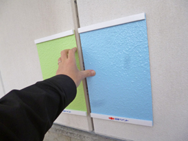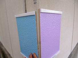 外壁はALCを守るために塗装します。スミレ工作所のイメージカラーを建て主の方にもサンプルで確認していただき、目地の廻りの細かな塗り分け方を施工会社の方と決めました。