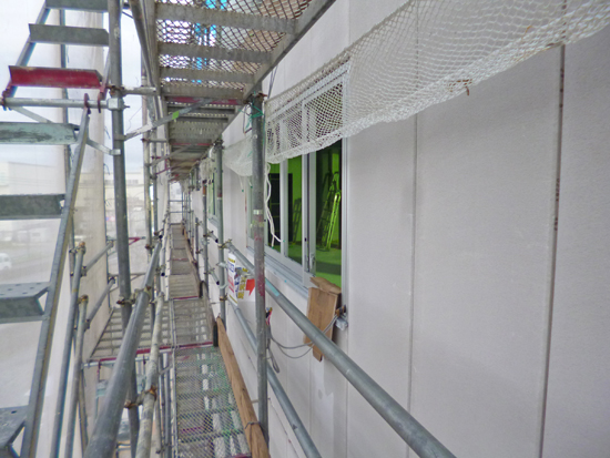 外壁のALCが施工され、アルミサッシも取り付けられたので、足場を伝って全体を確認してまわりました。