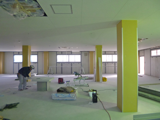 1階では、照明器具取り付け用のレースウェイやエアコン用の配管が天井に施工されました。柱の防火被覆は施工中です。スミレ工作所の方と照明器具や換気扇のスイッチ、エアコンのコントローラ、動力用のコンセントの位置などを確認して廻りました。