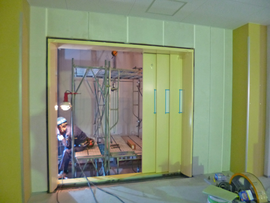 荷物用エレベーター(ロープ式・積載1500kg・3枚戸片引き式)の取付け工事中。部材を現場で組み立て取付けていくので、施工には20日以上、今月一杯かかります。