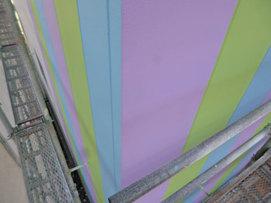 4/13(月)から足場解体がはじまるので、1階から3階まで外壁の施工状態や換気扇やサッシ外周のシールなどの施工を確認して廻りました。スミレ工作所のイメージカラー、紫・緑・水色も塗られています。