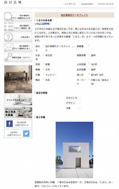 住まいのデザインサイト「設計広場」にアーキプレイスの『くるりのある家』『十字路に建つスキップハウス』『蕨市のコートハウス』の事例が掲載されました。