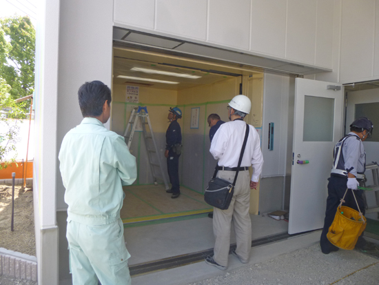 カゴの上に載ってエレベータを上下させて、火災時や地震時の停止状況、最上部のすき間などを確認。