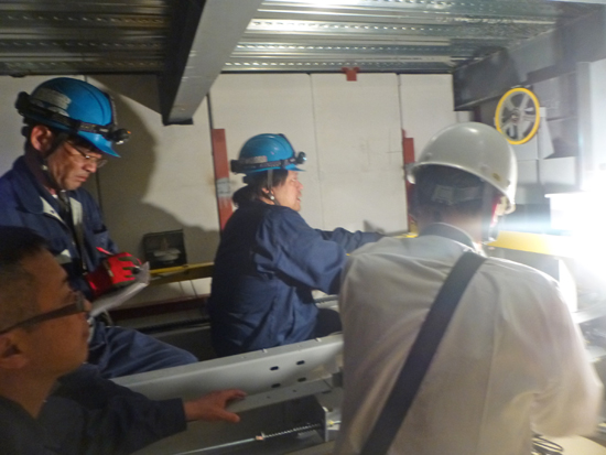 エレベータのカゴの上に乗りこんでの検査は、映画のようなスリルです。