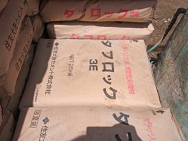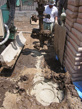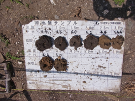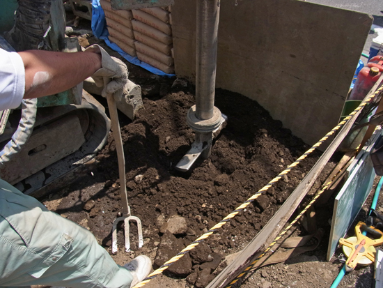 セメントミルクと現地地盤の土を撹拌して、地面の中に柱状の改良体をつくる柱状改良工法といわれる地盤改良です。(ジオテック株式会社のジオコラム工法)