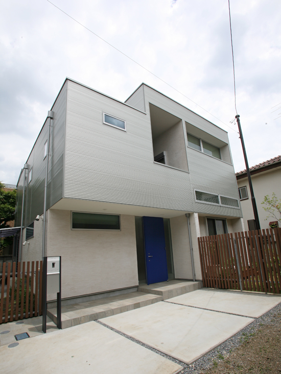 コート南(写真右側)の塀と勝手口側の管理扉(写真左側)は人工木材の格子で製作。玄関扉はフランスの伝統色から選んだブルーアドリアティック。手前は駐車スペースです。