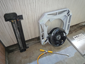 右写真の丸いのもが、待合室のエアコンのファン、その後ろのグレーのものがドレンパンです。左の黒いものは、診察室のエアコンのドレンパンです。