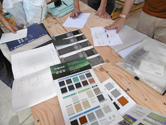 溶融亜鉛メッキのリン酸処理鋼板やガルバリウム鋼板、アルミサッシ、ファイバーグレーチング、レバーハンドルなどを、サンプルや図面で打合せ。