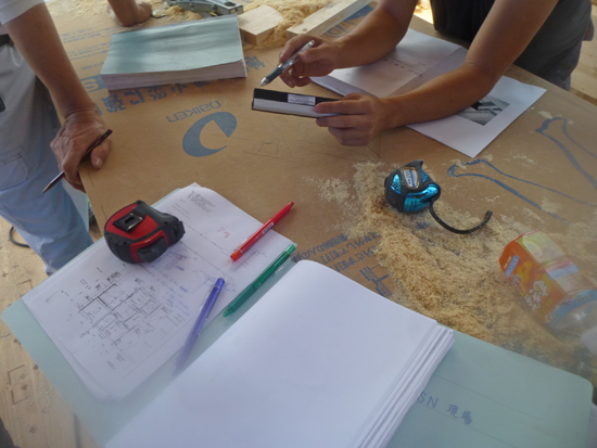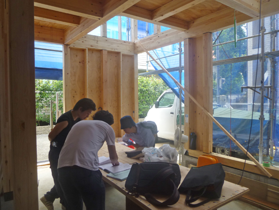 大工さん、現場監督さんとはパラペット周りのガルバリウム鋼板の笠木の形状や外壁の通気経路の作り方などを相談。