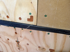 外壁の合板の施工を確認。透湿防水シートが貼られる前に雨に降られたとしても、内側まで濡れないように、合板の水平継ぎ目部にも防水テープが貼られており、とても丁寧な仕事ぶりが伺えました。