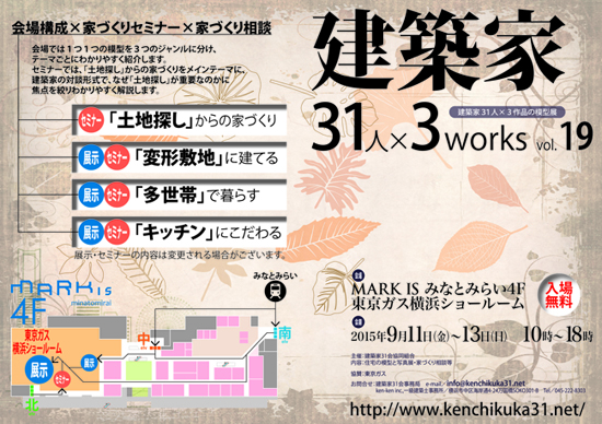 この模型展は、設計事務所アーキプレイス(石井正博・近藤民子)もメンバーである建築家31会が主催し、建築家たち自身により企画・運営するものです。今回は31組を2グループに分けた後半の建築家を中心とした住宅の模型やパネル、模型展を通して完成した住宅の実例パネルを展示し、建築家との家づくりを紹介します。