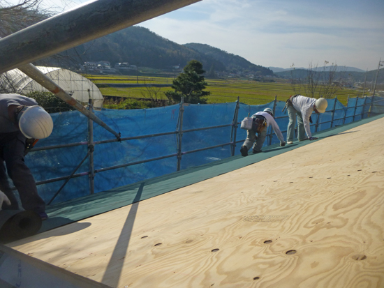 屋根の合板下地(通気層を含む)まで終わり、その上にアスファルトルーフィングを施工中。この後ガルバリウム鋼板の既製品屋根材アイジールーフ・ガルテクト(フッ素)が葺かれ、最後に太陽光発電のパネルを設置します。