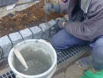 道路側植栽スペースを縁取るピンコロ石。目地に詰めたモルタルを一カ所づつ専用のコテで押えていく細かな作業です。