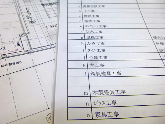 住宅(建築)の工事見積書は、大まかに言うと仮設工事〜土工事〜鉄筋工事〜〜〜ガラス工事〜家具工事〜設備工事〜電気工事など工事種別(中項目)ごとに金額がでていて、それを合算したものに工務店の経費を加え、消費税を足したものが総工事費になります。工事種別ごとの見積もりは、その根拠となる詳細な見積(単価×個数、単価×面積などに運搬費や各業者さんの経費などを加えたもの)で構成されています。