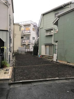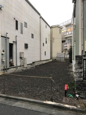 間口5.2m、奥行き約18mの細長く奥が深い敷地。写真では分かりにくいですが、敷地境界線が斜めになっていて、奥に行くほど敷地の幅が徐々に狭くなり、最小幅4.2mとなったその先は、こんどは敷地の幅が徐々に広くなった複雑な形をしています。