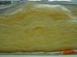 厚さ100、16K、熱抵抗値2.2の断面写真。グラウウールは、ガラスを溶かし、綿状の繊維にして固めて作ります。
