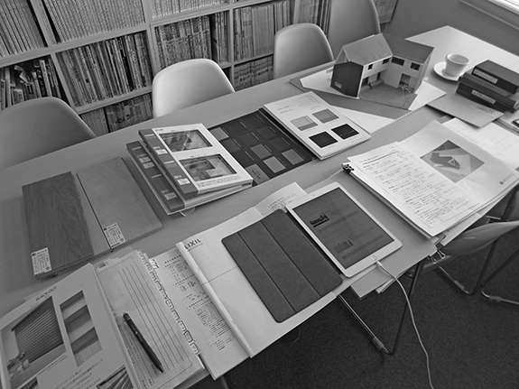 『ミカンの木の育つ二世帯住宅』(在来木造2階建)の、見積もり調整は大詰めを迎え、目標金額まであと少しとなります。見積り調整中に仕上げ材の変更もあったので、主要な仕上げ材のサンプルをお見せしながら再確認しました。