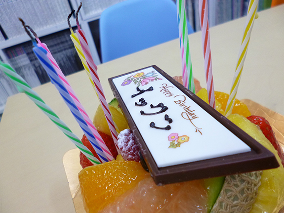 突然、部屋の照明が消えたのにお構いましに仕事を続けていたら、ケーキを持った近藤が「Happy Barthday・・・♪」と唄いながら現れました。