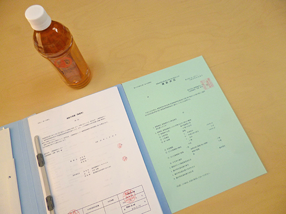約束の時間より少し早く確認検査機関に着いたのでエレベータホールで待っていたら、部屋の中の椅子を勧められ、ペットボトルのお茶をいただきました。担当の方にはお昼休みを削って素早く対応していただきました(感謝)。
