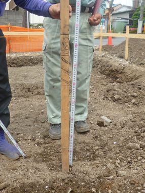土が所定の深さまで掘られいるかどうか、根伐り底(ねぎりぞこ)から基準のなる高さに張った水糸までの高さをメジャーで測り確認します。