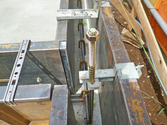 基礎の幅(型枠間の寸法)は15センチメートル。止水用のKUNI SEAL(クニシール)(粘土状のグレー)が設置されていることも確認。