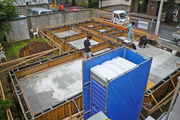 『桜並木と暮らす家』(木造2階建・在来工法)の工事現場では、先週のコンクリート打設が終わった基礎耐圧盤の上に、基礎立上りの鉄筋やアンカーが施工され、型枠が組まれました。