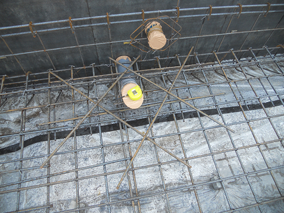 ポイントは(1)貫通部の断面欠損にる構造強度不足にならないようにすること。(2)基礎廻りの配管貫通部での止水を確実の行うこと。の2点です。