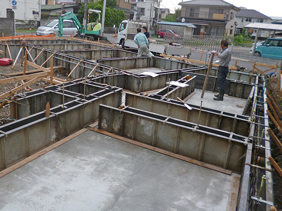 基礎の型枠には、コンクリートパネル(コンパネ)を使って現場に合わせて作る場合と、スチール製の既製品型枠を使って組む二つの方法があり、それぞれ一長一短があります。工事会社の現場監督さんは、施工性の観点からこの現場ではスチール製の既製品型枠を選択されました。