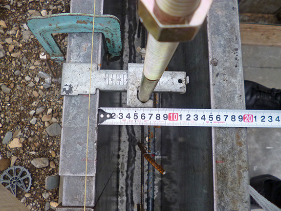 鉄筋コンクリートの基礎の幅は15cmです。耐力壁で、室内側の合板を真壁納まりとする場所があり、受け材とホールダウン金物の干渉をさけるため、アンカーボルトは基礎の中心でなく外側に15mm偏芯させたところに設置しています。アンカーボルトの位置もメジャーを当てて確認します。