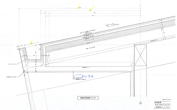 屋根の先端部分には内樋が隠れていますが、詳細図を書いて納まりの細かな寸法を確認してから、構造体であるプレカット図の寸法を決めていきます。