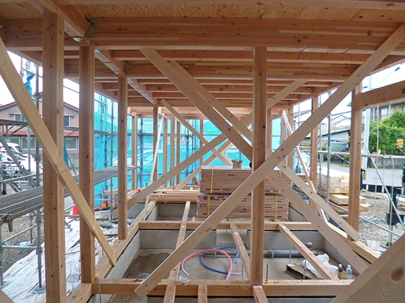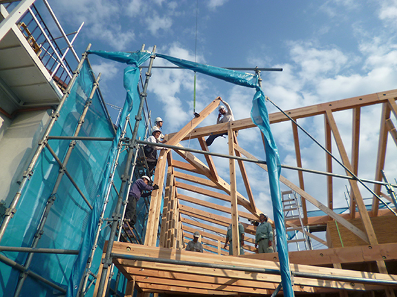 斜めの接合箇所が多い構造のため、建て方は夕方6時近くまでかかりました。