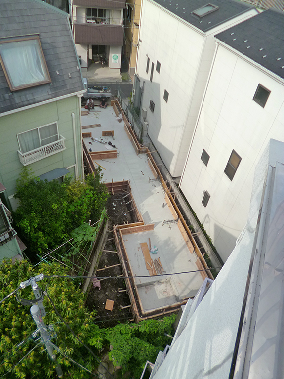 基礎の耐圧盤のコンクリートが打たれたあと、基礎の立上りの型枠を施工中。上から見ると基礎の形や建物と敷地との関係がよくわかります。中央付近のくびれている部分が中庭で、隣地の庭に呼応させたい位置にあります。