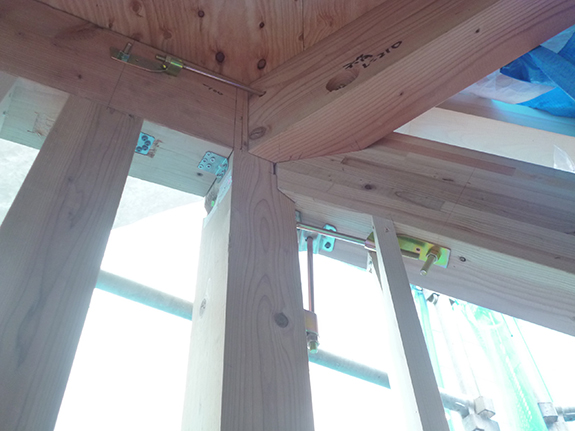 タスキ状に入っている室内の仮筋交いは、耐力壁の合板が貼られてから取り外します。