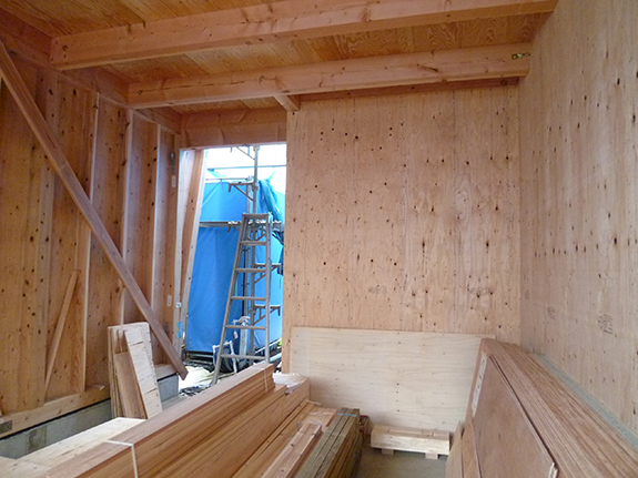 コボットの下は合板を貼った耐力壁で、合板は柱面内に入れる真壁納めとしているので、合板を留めるための受け桟が柱に取り付けられています。