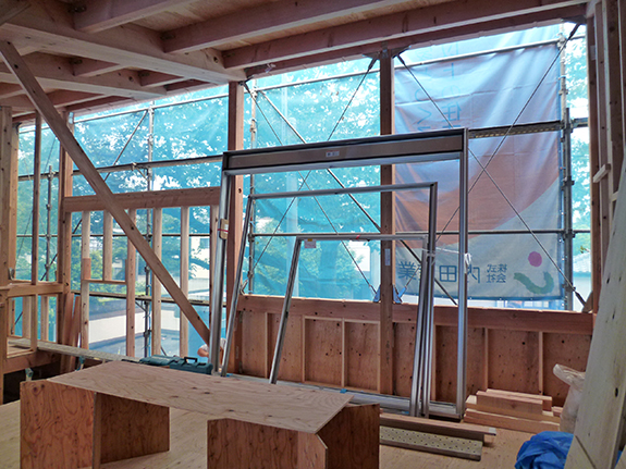 和室から屋根のかかるテラスを見たところ。アルミサッシの窓が運び込まれています。