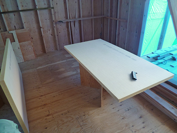 床に書いてもらった墨(線)で、キッチンカウンターとダイニングテーブルやソファとの関係を確かめていたところ、現場監督さんが即席でテーブルを作ってくれたので、建て主の方には実際にほぼ近い形で見ていただきながら確認できました。