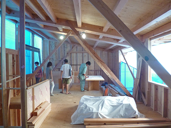 週末、『桜並木と暮らす家』(木造2階建・在来工法)の建て主の方と工事現場でお打合せしました。(8/6)
