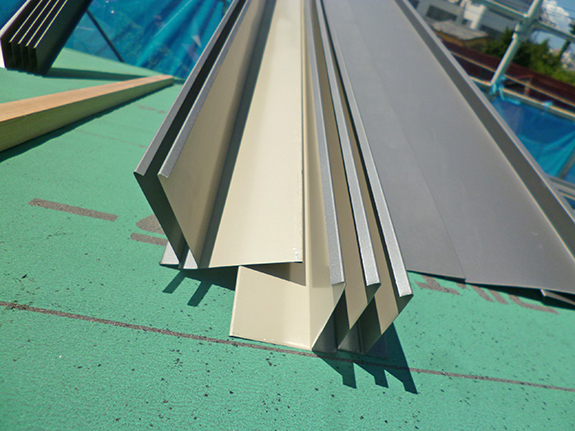 ガルバリウム鋼板たてハゼ葺きの材料が屋根に運び上げられました。今回は、たてハゼ部分がキャップ式となった既製品の板金を使います。