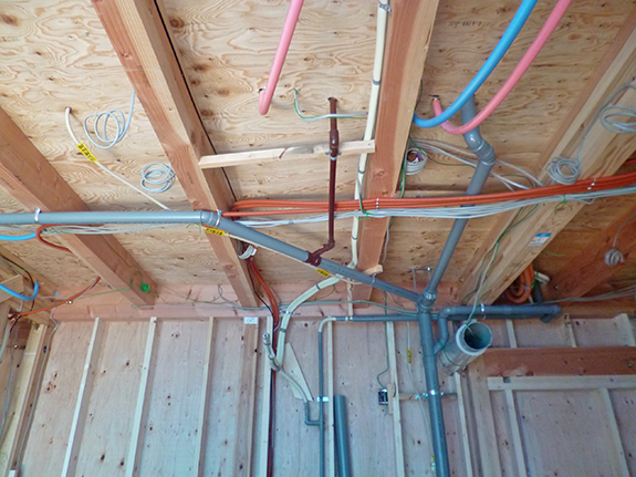 1階の天井には、2階の給水、給湯、排水などの配管が施工されています。