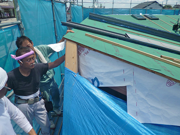 この住宅で施工が難しい部分の一つである、三角形部分の納め方を板金屋さんを交えて打ち合わせ。