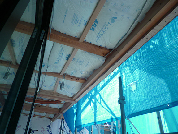 1階テラスの上には、2階の部屋の断熱のための繊維系断熱材グラスウールが施工されました。