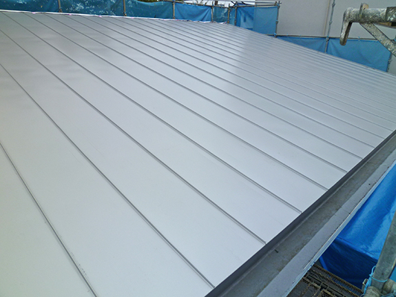 屋根はガルバリウム鋼板のタテハゼ葺き。とても綺麗に施工されました。軒先き側に内樋(うちどい)があります。