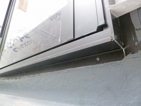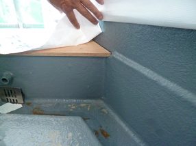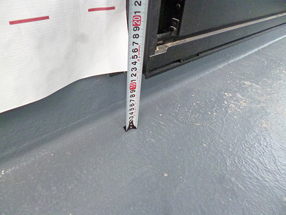デッキテラスのFRP防水の確認。FRP防水の立ち上がり高さ、水勾配、排水溝、排水口廻りなどをチェックします。