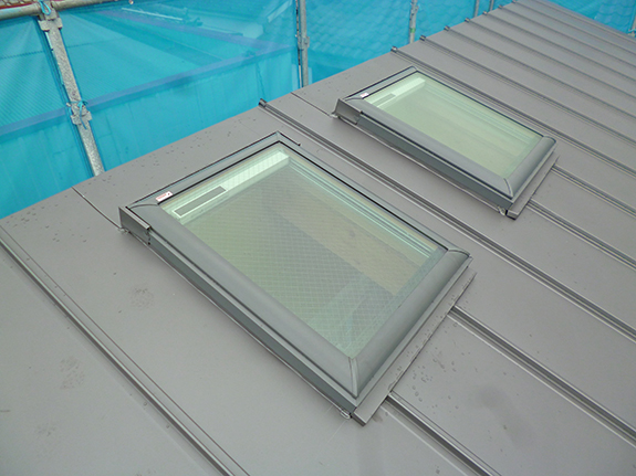 緩勾配の傾斜屋根につくトップライト(VELUXベルックス製:スカイビューシリーズVS電動タイプ)の外廻りが完成し、日本ベルックスの方にも見ていただきました。