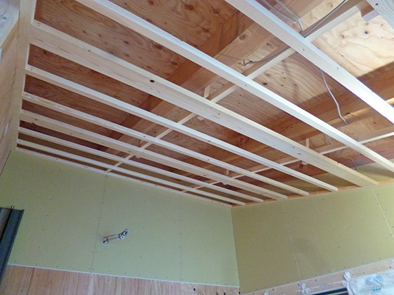 2の傾斜天井には天井の下地(野縁)が組まれ始めました。